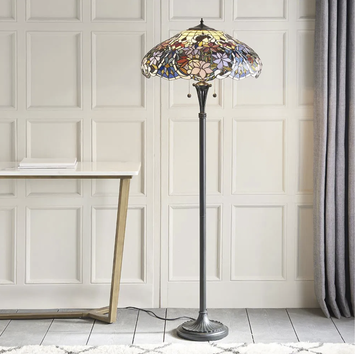 When you’re choosing a floor lamp, you need to find a design that suits the current style of your room. For a modern look, think sleek metals and minimal lines, like the Endon Briar. For boho, you’re probably better choosing something with a rattan or fringed shade, or a playful shape, like the Interiors 1900 Sullivan Tiffany lamp. If industrial chic is more your thing, then look to lamps with a matte finish and exposed bulbs, again like the Alta. While mid-century style can best be complemented with lamps with tripod legs, globe shades, and warm tones, like the Endon Mathias.